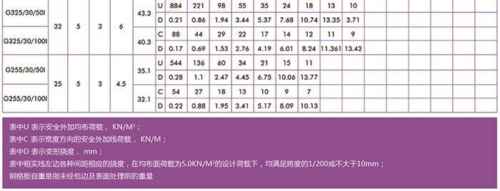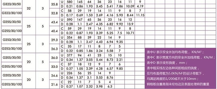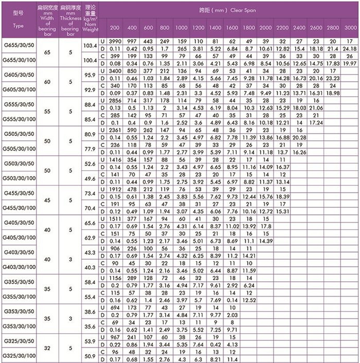 平面型扁鋼中心距為30常用格柵板規(guī)格型號(hào)及安全荷載表