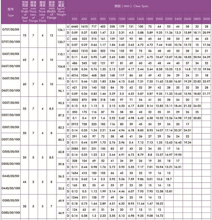 工字型扁鋼中心距為30常用格柵板規(guī)格型號(hào)及安全荷載表
